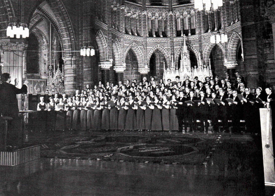 Reisje naar Newcastle In 1956 verbleef het koor Pro Musica met als dirigent Lex Karsemeijer een weekje in Newcastle als tegenbezoek van het koor The Newcastle Ladies Choir dat een jaar eerder een week in Bussum was. Een korte beschrijving van dit bezoek. Nol Verhagen Hierbij een aanvulling van Rene Meyer, Statenlaan 30 “Pro Musica in de jaren 50. Plaats en datum van deze foto zijn onbekend”. Welnu: plaats is de Sint Vituskerk in Hilversum, en de datum is in ieder geval na 1965. Dat laatste leid ik af uit de lampen boven het priesterkoor, en de niet meer aanwezige zijvleugels langs het hoogaltaar op de achtergrond. In 1965 werd het priesterkoor aangepast aan de nieuwe liturgie die haar intrede deed na het Tweede Vaticaans concilie. Daarbij verdwenen bedoelde zijvleugel, de communiebanken (die voorheen stonden waar op de foto het het koor staat) en de preekstoel en werden de lampen vervangen. Voorts werd een nieuw altaar en werden nieuwe koorbanken geplaatst. Van die koorbanken zie je nog een glimp naast de meest links staande dame. |