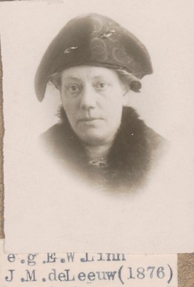 Jacomina Maria de Leeuw is geboren op 14-10-1876 in Amsterdam als dochter van Andries J. de Leeuw en Jacomina M. Rijnders. Zij had een zus PBM2837 en vijf broers waarvan er eentje overleed toen hij 19 was en cadet aan de KMA was. Zij trouwde op 2-8-1906 met Emile Wilhelm Linn (7-9-1875), een van de kinderen van Richard Wilhelm Linn, zie artikel BK-2023-28. Zijn moeder was in 1884, na het overlijden van haar man in 1880, naar Bussum gekomen en startte een pension. Hij kwam in mei 1900 uit Antwerpen naar Bussum, Nassaupark 11 (= villa Plantijn). Zij kwam in september 1902 uit Amsterdam. Hij was kantoormedewerker. Twee dochters: Gertruda A.M. in 1907 en Andrea J.E. in 1910. April 1924 verhuisden ze naar Ruthardlaan 1. Maar toen hij op 1-1-1957 overleed wordt in de overlijdensadvertentie nog steeds (of weer) Nassaupark 11 genoemd). Haar jongste dochter was na haar huwelijk gaan wonen in Apeldoorn. Daar ging Jacomina ook heen zoals eerder haar zus ook had gedaan. Jacomina overleed in Apeldoorn op 8-8-1960 Originele fotoboek:https://archiefgooienvechtstreek.nl/SSAN052 inv.nr. 8190 + 8191 |