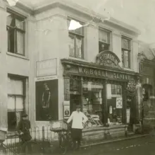 De eerste winkels aan de Nassaulaan | BK-2025-29A | In 1880 werd villa Nassau in tien kavels geveild. Een jaar later verschenen de eerste winkels aan de Nassaulaan. De eerste was de manufacturenzaak van Antonius Bus. (Nassaulaan 1. Het pand werd in 1967 uitgebreid met Brinklaan 66.) De tweede was de 'Mineraalwaterfabriek' van Gerard Dijkhuis. Dijkhu... |